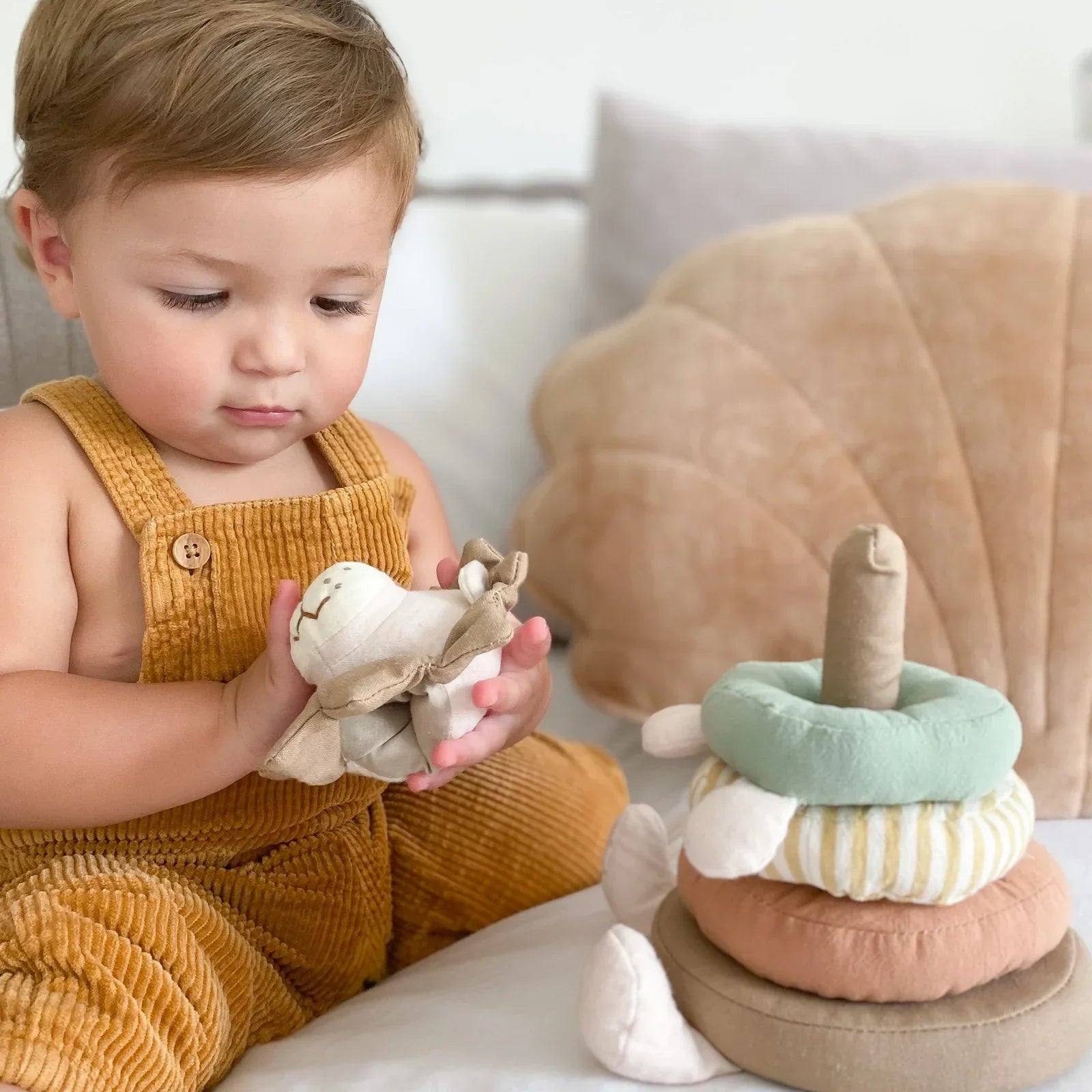 Safari Lion Stacker is an adorable baby stacker toy featuring four soft fabric rings in eye-catching colors and prints. Help a little one boost motor skills and eye-hand coordination with this beautifully detailed baby activity toy. Ideal for babies who are a few months old to toddlers, our baby stacker toy provides hours of amusement and educational play.